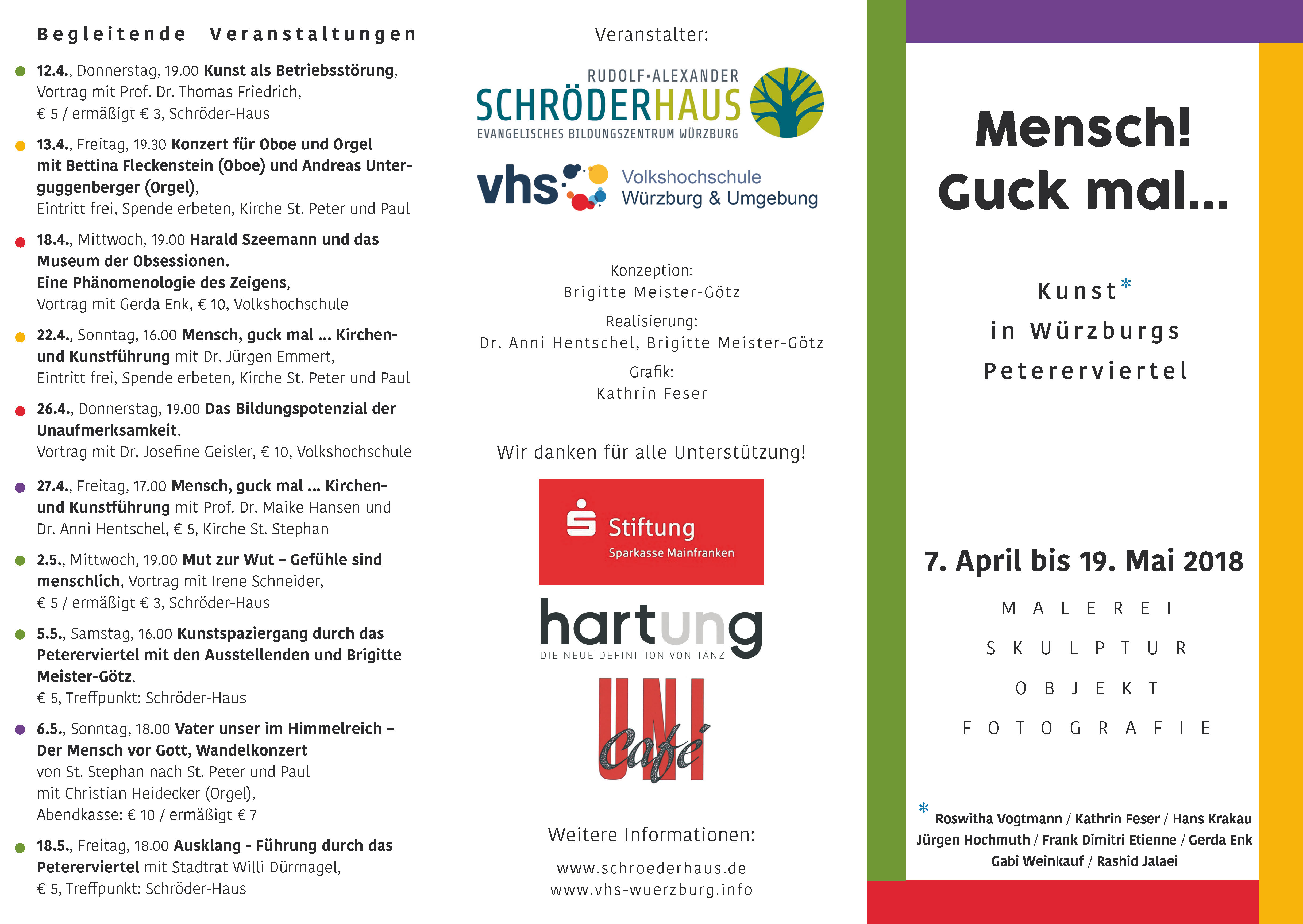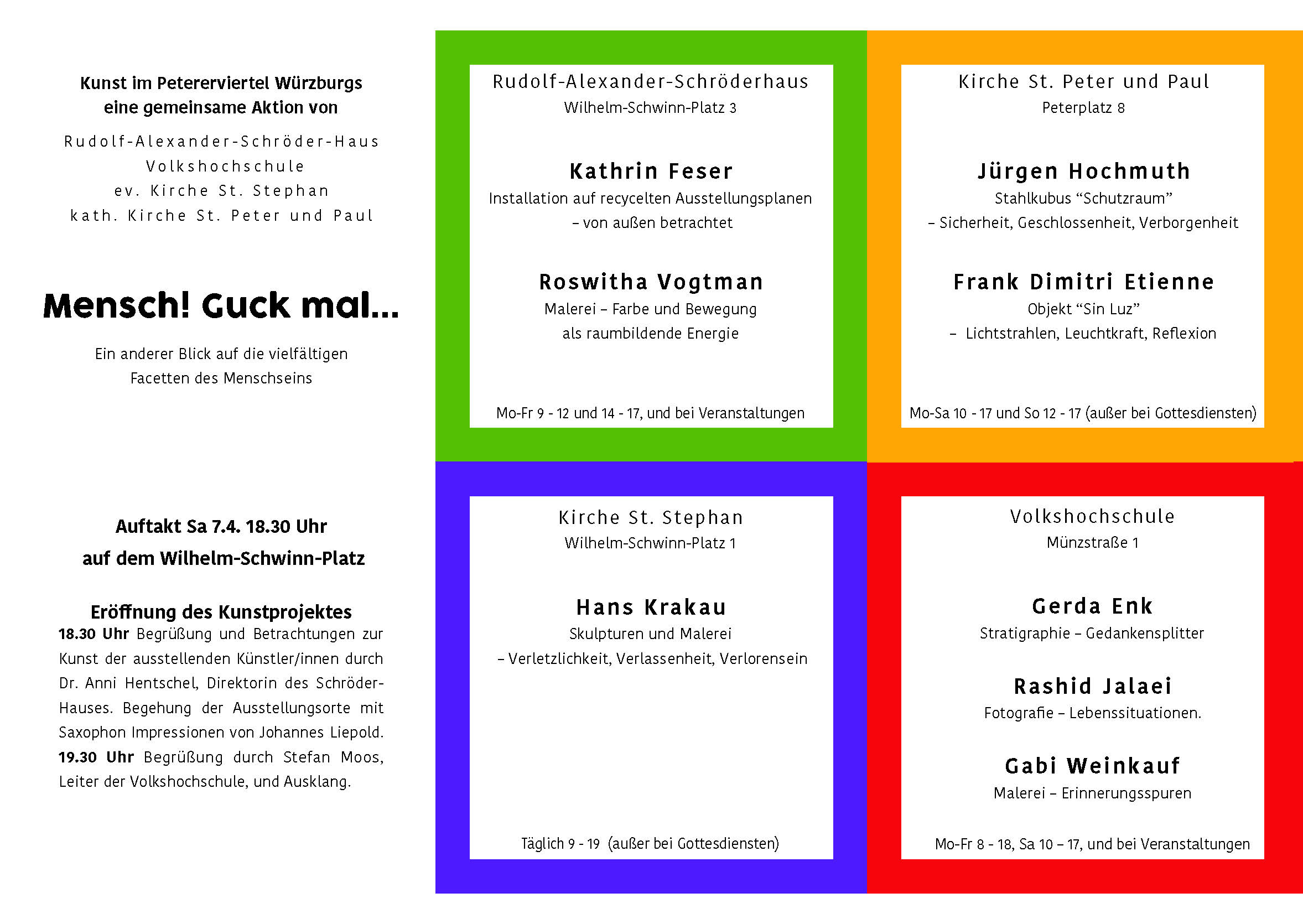 Austellung im Schröderhaus bis 27. Juli verlängert! Ausstellung "Mensch guck mal ..." Kunst in Würzburgs Petererviertel Malerei - Skulptur - Objekt - Fotografie 7. April - 19. Mai 2018 Eröffnung des Kunstprojekts Sa 7. 4. um 18.30 Uhr auf dem Wilhelm-Schwinn-Platz (vor dem Schröderhaus): Begrüßung und Betrachtungen zur Kunst der ausstellenden KünstlerInnen durch Dr. Anni Hentschel, Direktorin des Schröderhauses. Begehung der Ausstellungsorte mit Saxophon-Impressionen von Johannes Liepold. 19.30 Uhr Begrüßung in der vhs durch Stefan Moos, Leiter der Volkshochschule. Rudolf-Alexander-Schröderhaus: Roswitha Vogtmann - Malerei auf Leinwand Kathrin Feser - Installation auf recycelten Planen - von außen betrachtet Kirche St. Stephan: Hans Krakau - Skulpturen und Malerei Kirche St. Peter und Paul Jürgen Hochmuth - Skulptur Frank Dimitri Etienne - Lichtobjekt Volkshochschule Gerda Enk - Stratigraphie Rashid Jalaei - Fotografie Gabi Weinkauf - Malerei Weitere Informationen u.a. zu den begleitenden Veranstaltungen während der gesamten Ausstellungsdauer siehe Flyer-Seite 1, Flyer-Seite 2 |