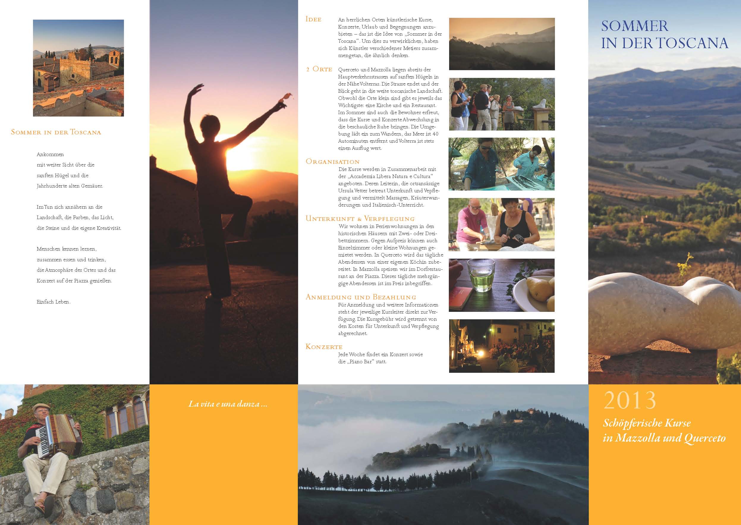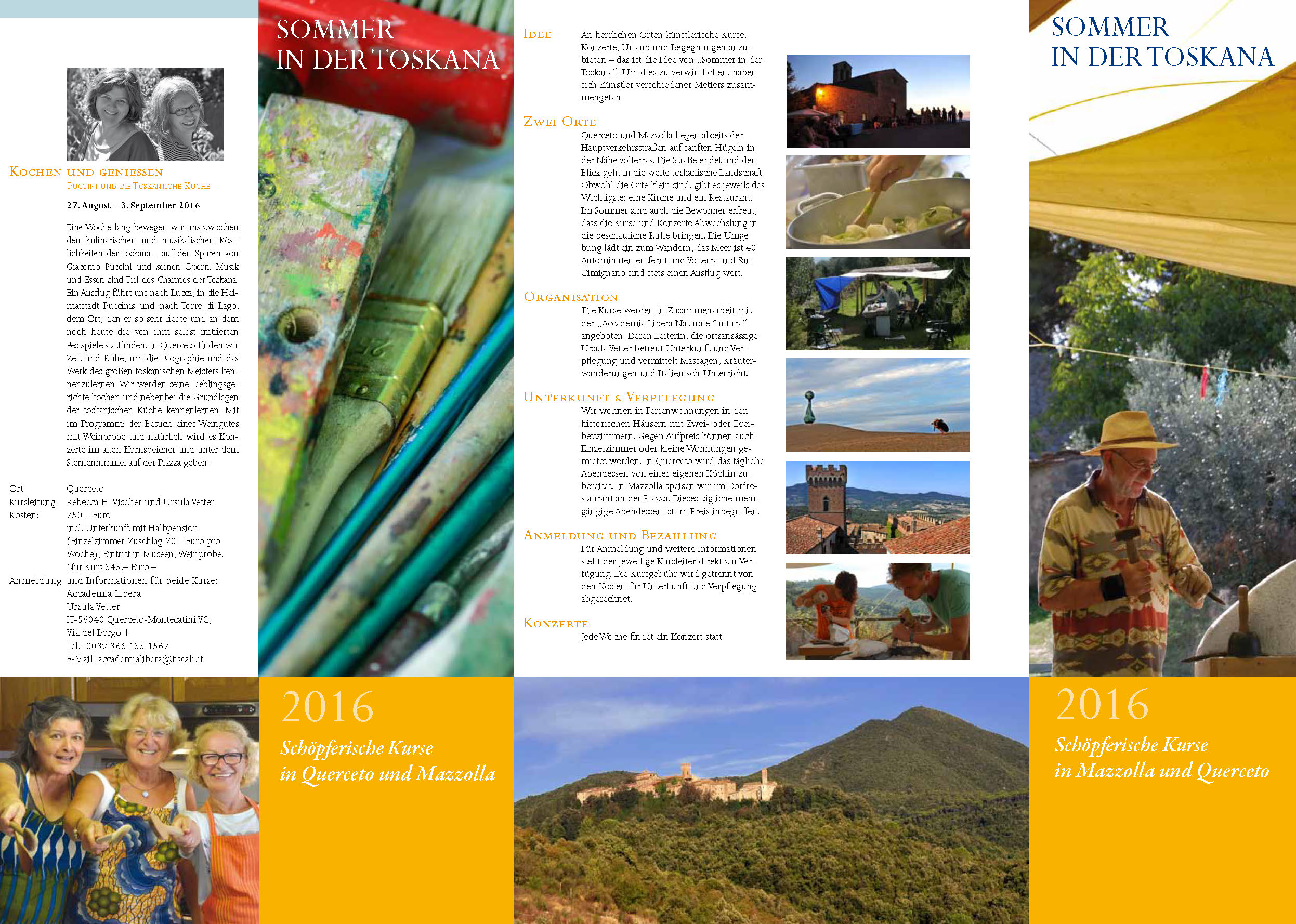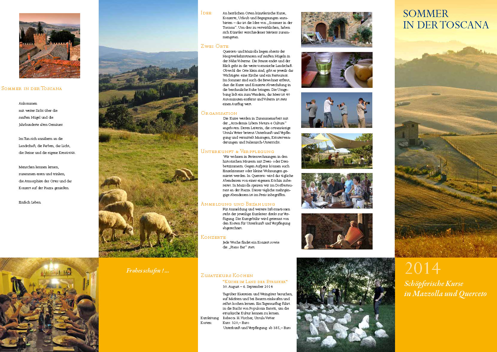 „Sommer in der Toskana - Querceto" Sa 27. August – Sa 3. September 2016 (weitere Infos unter Kurse) Kursflyer Seite 1, Seite 2 |