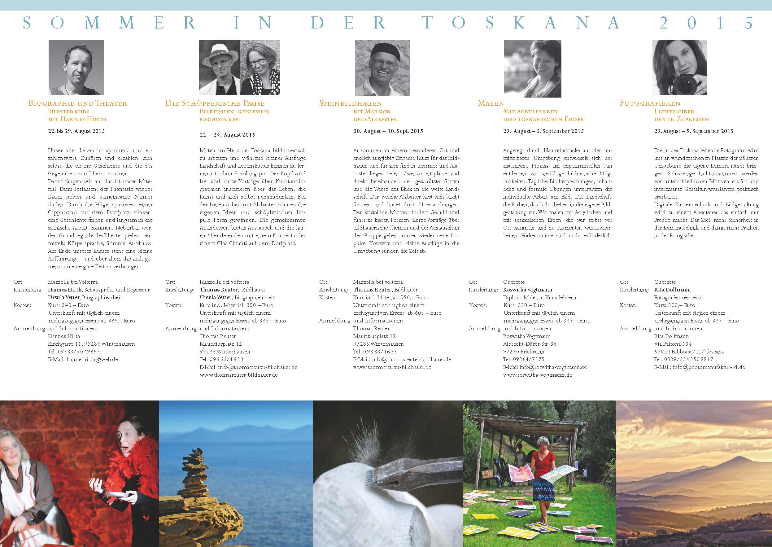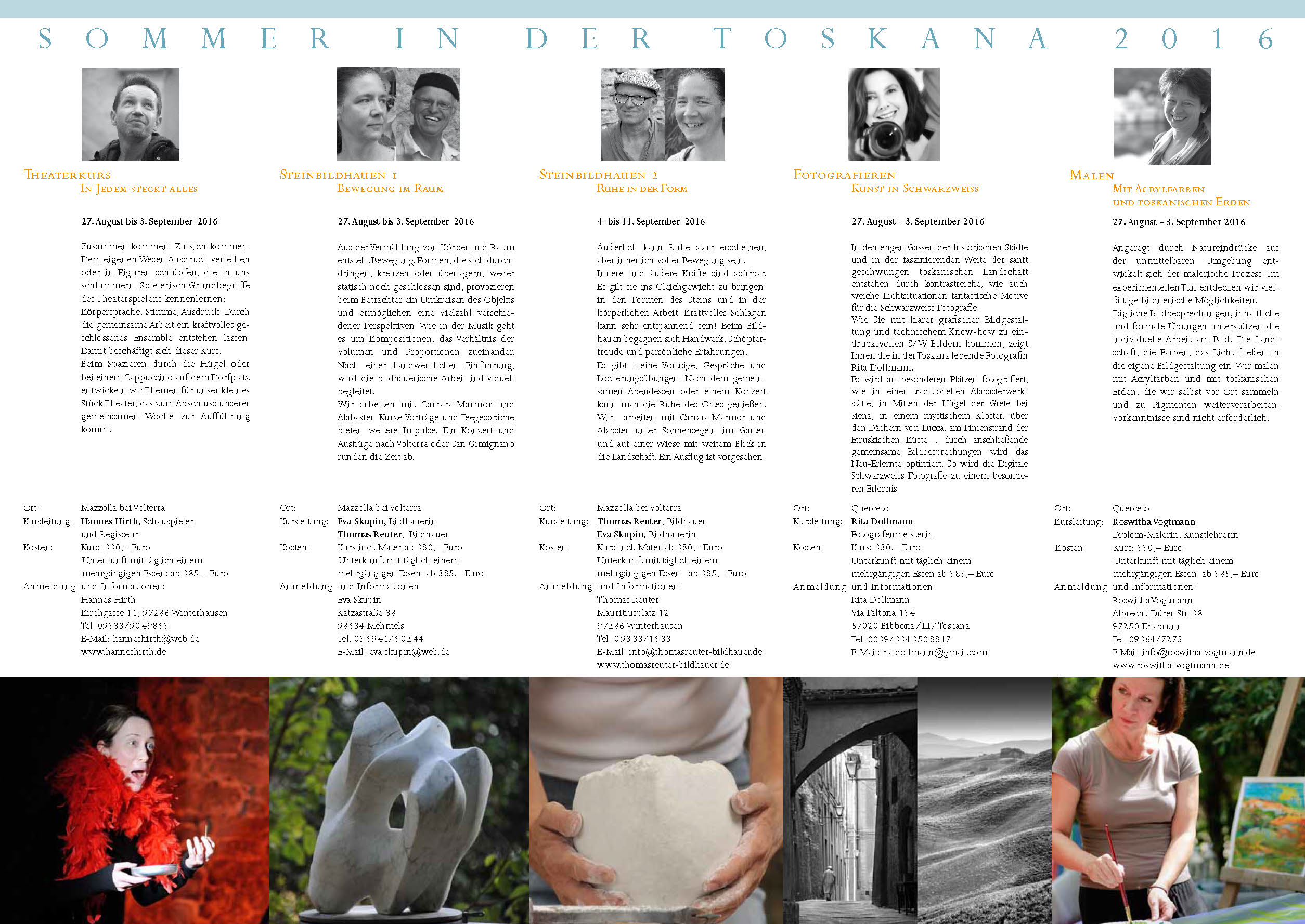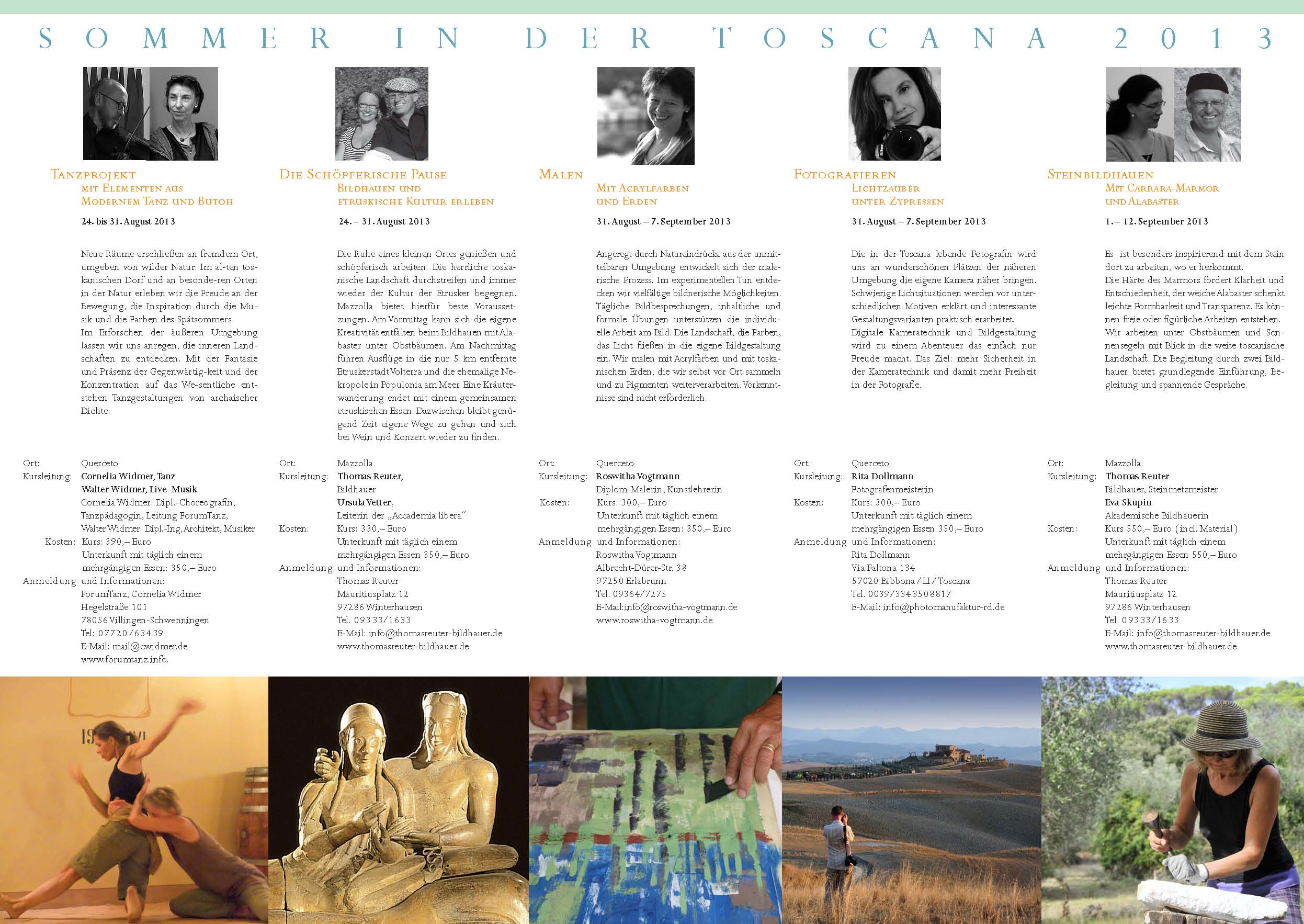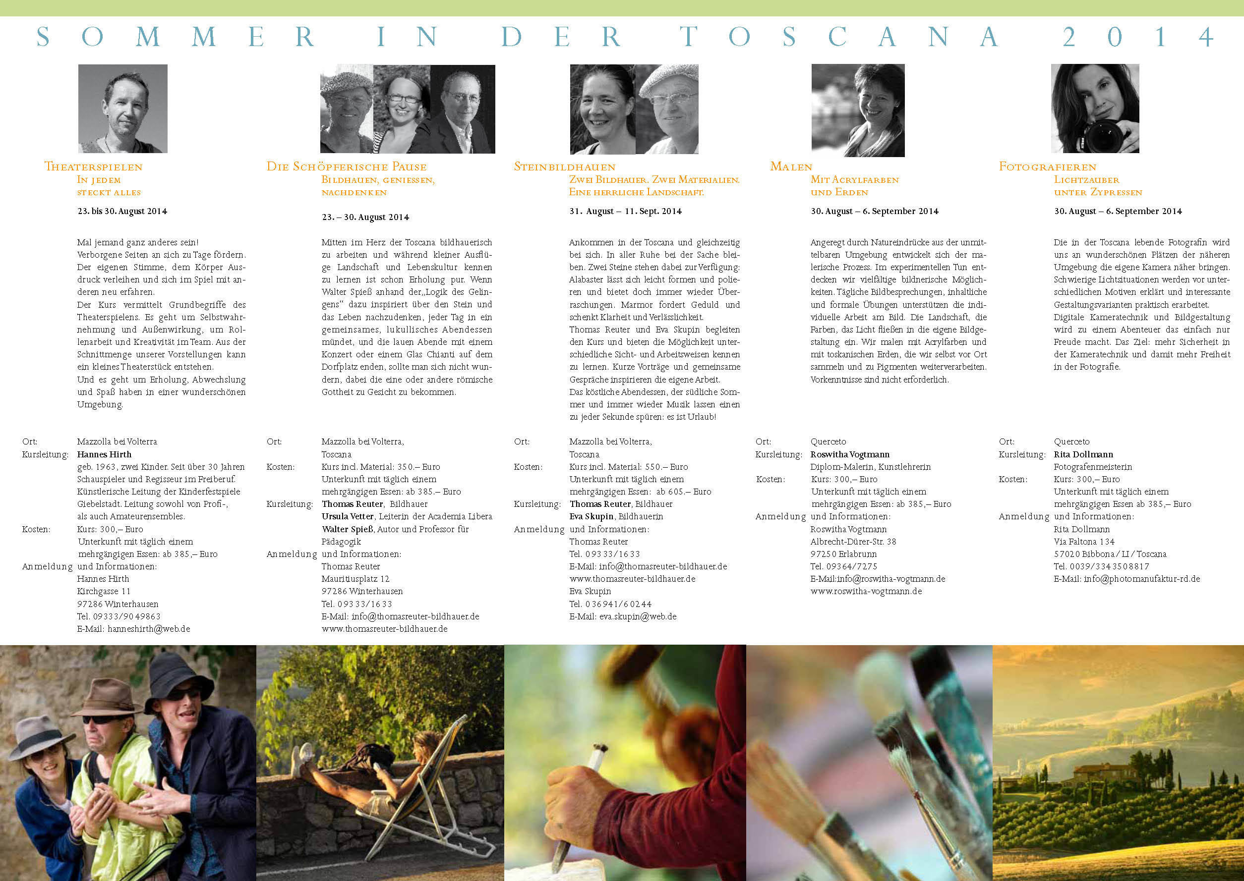 „Sommer in der Toskana - Querceto" Sa 27. August – Sa 3. September 2016 (weitere Infos unter Kurse) Kursflyer Seite 1, Seite 2 |